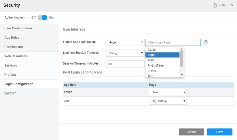 • Page: On session timeout, the user is redirected to the configured login page. Any page can be configured to redirect the user on session timeout.