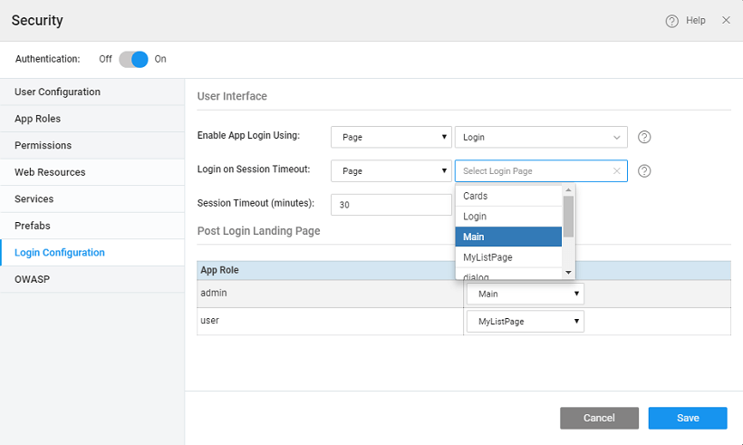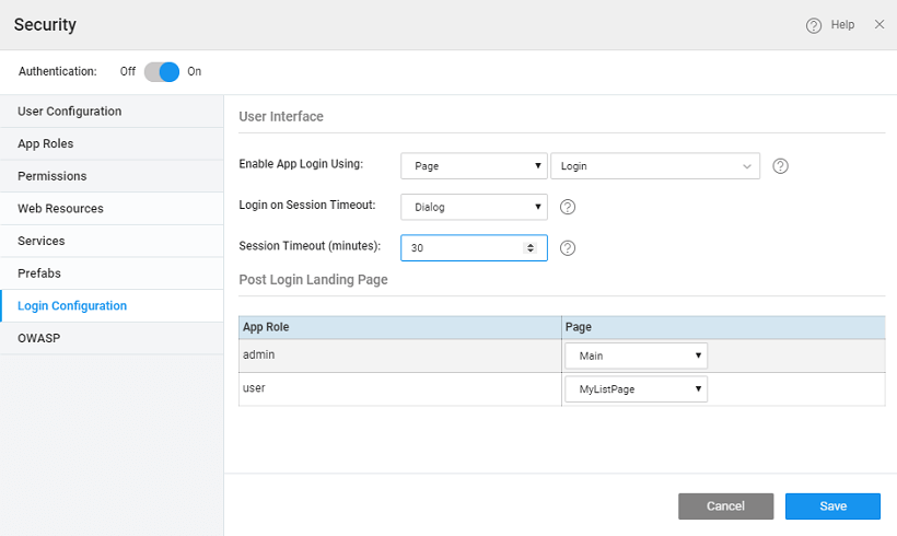 Session timeout behavior can also be defined. Session timeout occurs due to session inactivity or deletion of browser cookies. The re-login mechanism in the app can be configured as follows: