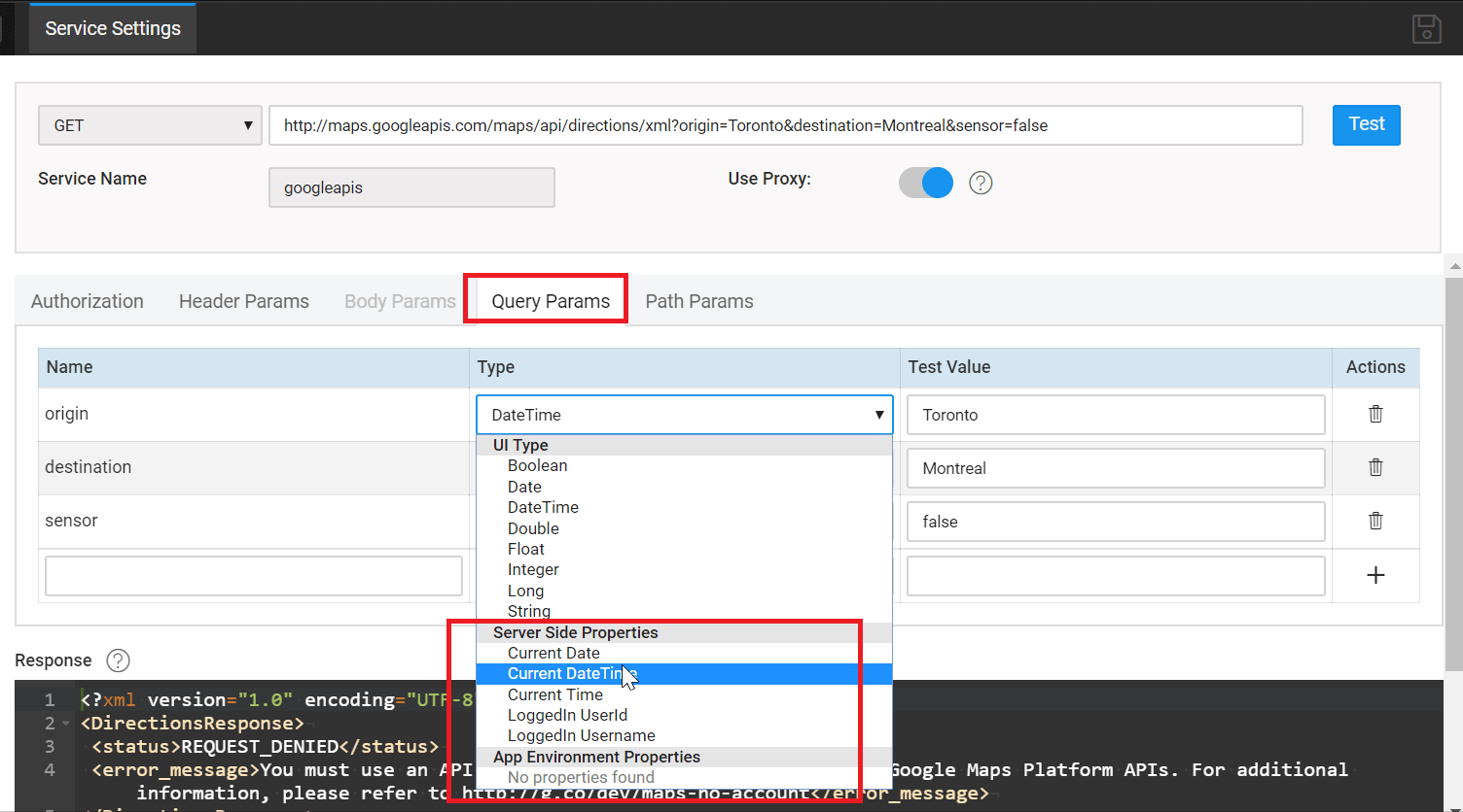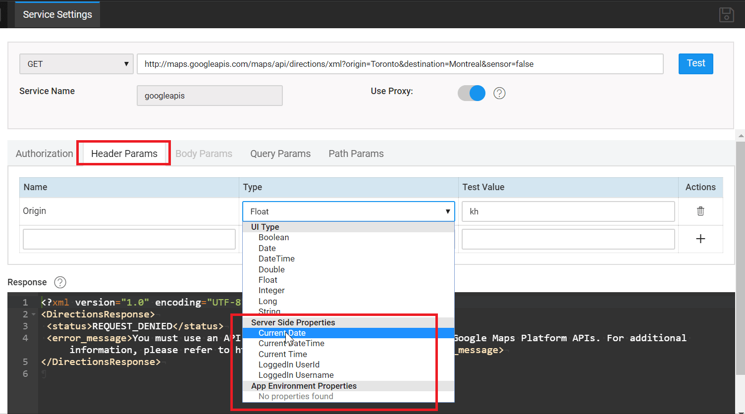 When configuring REST API, you add parameter name, data type and test value depending on the service requirements. To learn how to add REST services, see Third Party REST Services. Following are the three types of Properties for using Header and Query params data types: