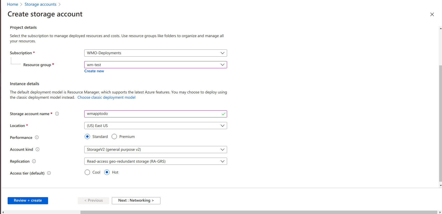 • In the advanced section select blob access and security options, next provide tags for the storage account and review the details and create a storage account.