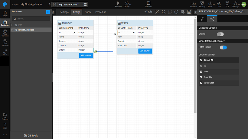 Relations are a way to establish a connection between tables within a given database. It takes care of the consistency while linking two tables. In WaveMaker, there are two ways of creating relationships: