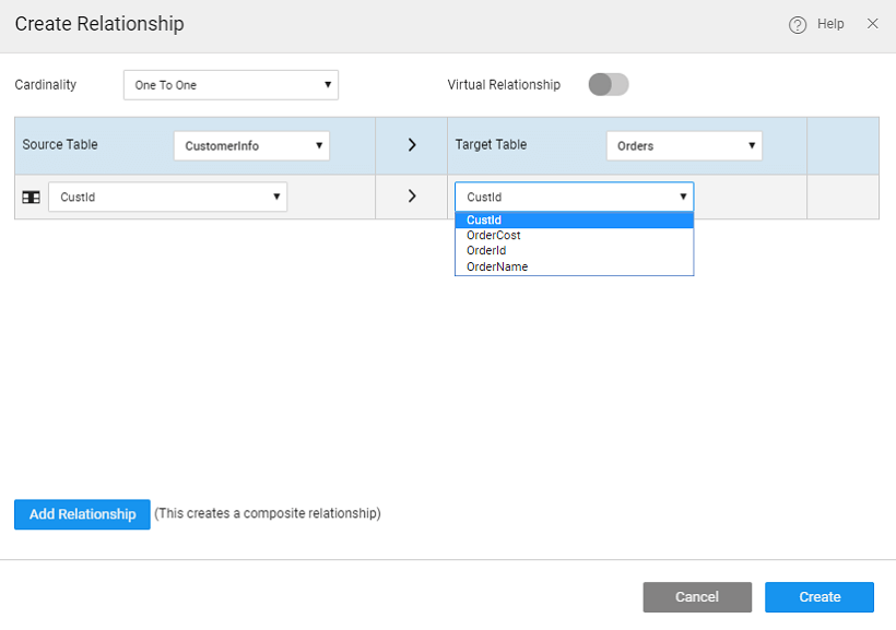 • One-to-Many Composite relation is possible when Table 1 has the composite keys and Table 2 has at least one non-Composite key column selected.