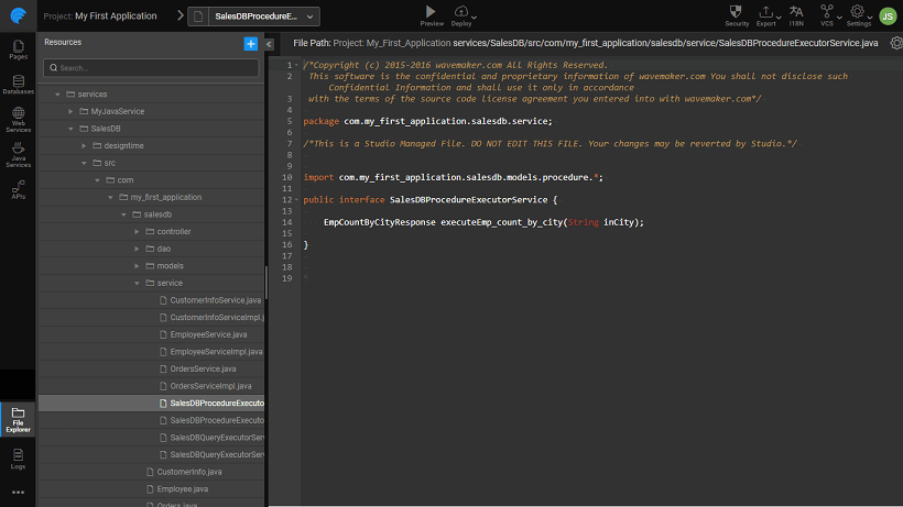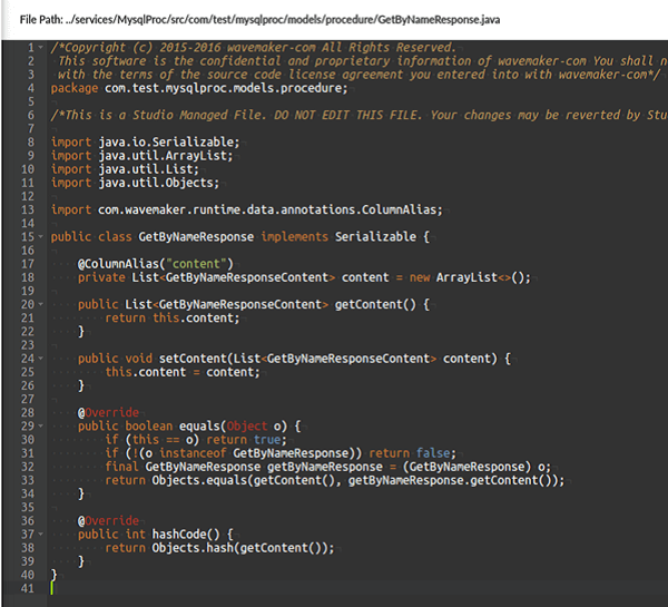 WaveMaker supports the execution of procedures/functions written using PL/SQL. You can find out more about Stored Procedures here. In this section, we will be seeing how WaveMaker supports Stored Procedures with the help of an example. We are using a MySQL database.