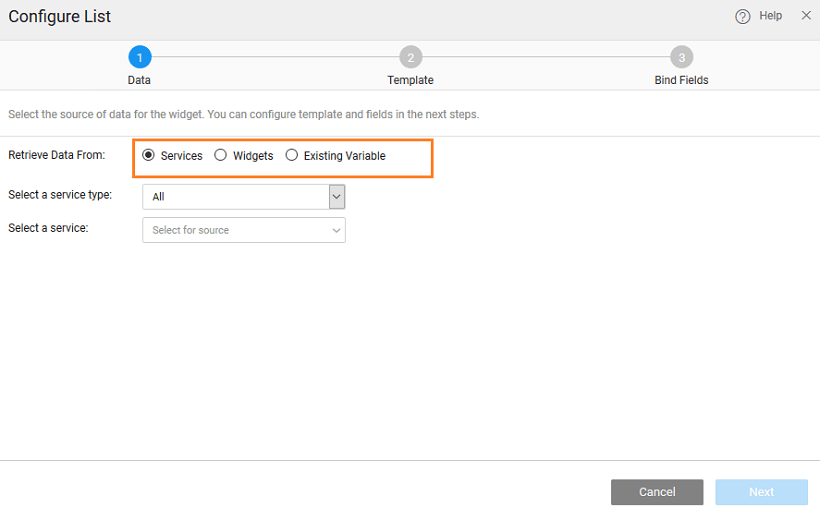 The first step in configuring a list is to define the data that needs to be displayed. This data can be in the form of Services or Widget or Existing Variable.