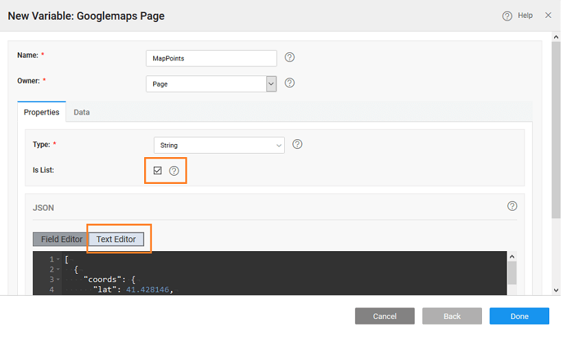 2. Create a custom variable as per your requirements. Know more from here. Then enable the isList property, and enter the appropriate JSON in the Text Editor. screenshot As an example you can use the following: