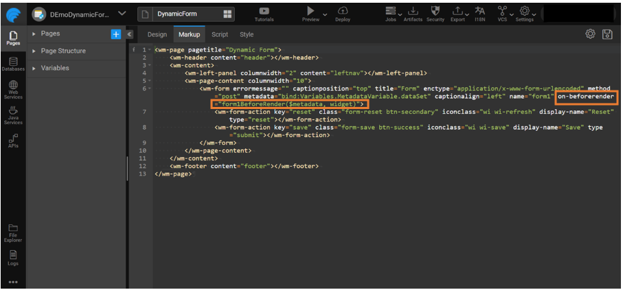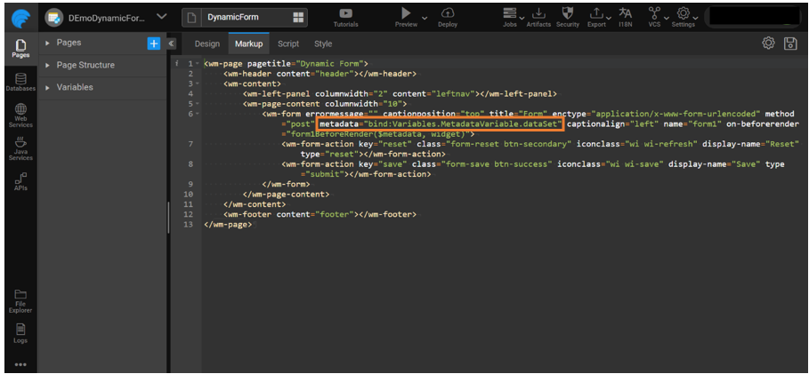 1. Go to the Markup tab and add metadata property in the markup with the created variable to bind the variable holding metadata with the Form.
