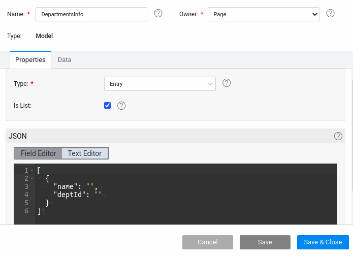 • Create a Page and create a Model Variable with an Entity type of the below specified dataset.