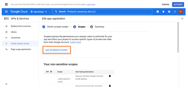 4. In Scopes, click Add or Remove Scopes.