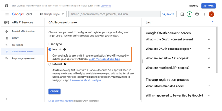 2. Select the Internal option to allow the enterprise oriented Google accounts of the authorized domains to be displayed during the time of SSO.