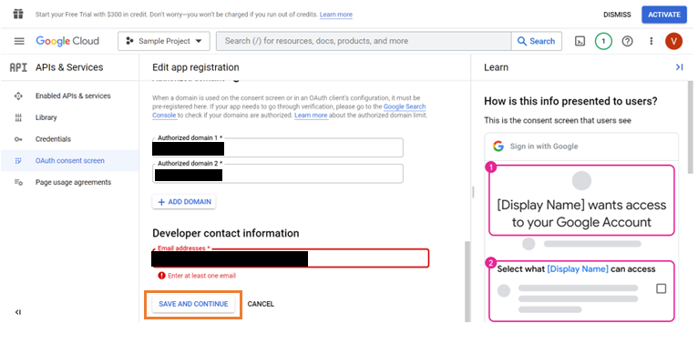 3. Provide the App name, User support email, Application Logo, Authorized domains, and Email address of the developer. Click Save and Continue.