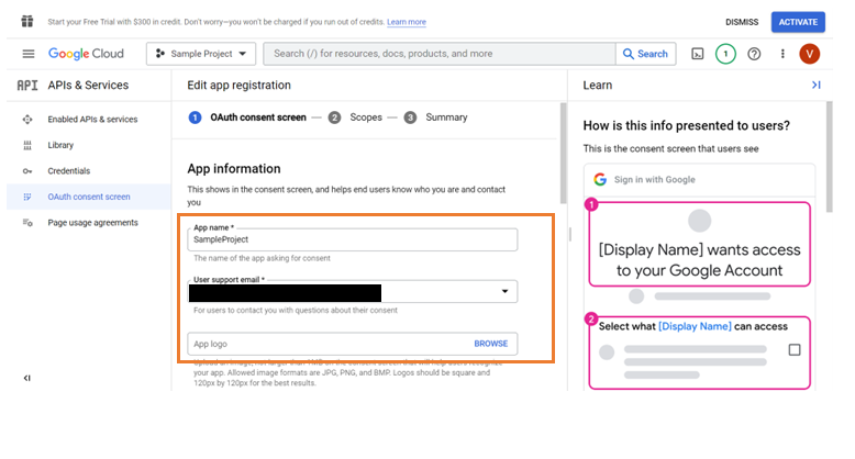 1. Set up user account in the Google Console. This is to create an OAuth application to fetch the Client ID and Client Secret.