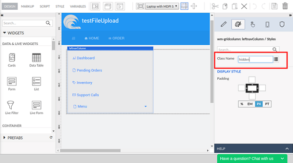 Navigate to the Style tab of the properties panel and set the Class Name property for this grid column as “hidden”.