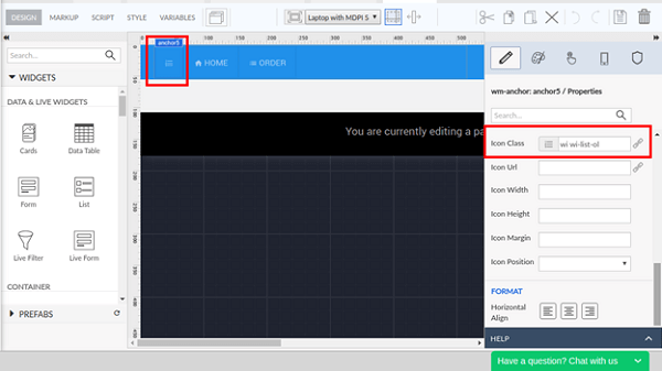 Open the topnav partial page and add an anchor widget. Specify the icon Class as “wi wi-list-ol” for the newly added anchor.