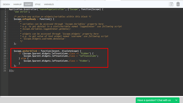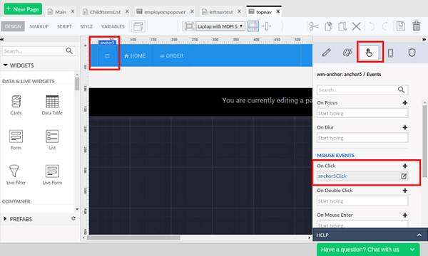 For the onClick event of the anchor, choose JavaScript as operation. For the function generated in the Script tab of the page, place the below mentioned code snippet: