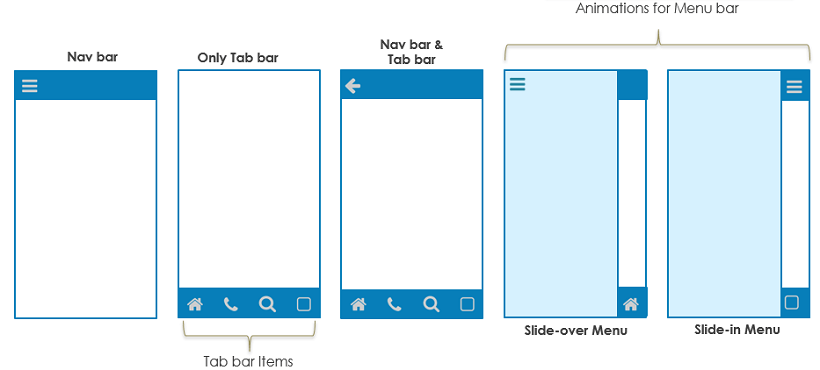 As mentioned in the previous section, default top navbar can be selected as part of the Page Layout. This Navbar can be configured to enable pre-defined controls for left navigation, back button or search. In addition, custom actions like add, edit, delete etc. can also be incorporated. Navbar can have Menu, Popover widgets.