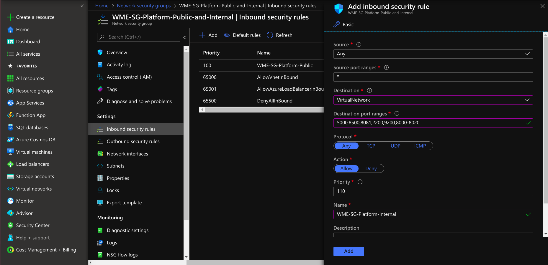 Create a security rule to open additional ports for access from the Platform Virtual Machine. Select a destination.based on the destination it applies the rules to virtual machines.