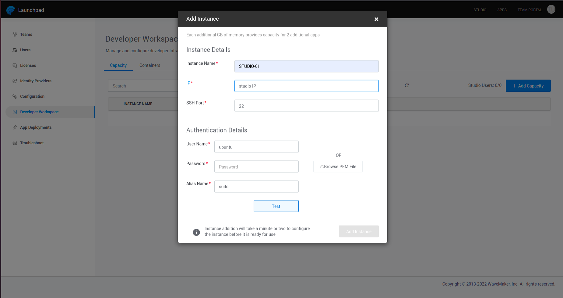 Once you have Launched Instances, Initialized, Set up and configured the WME, it is time for the developers to log in and build apps. For this, you need to add developer and deployment infrastructure capacity by adding instances. If not setup StudioWorkspace Instance / AppDeployment Instance ,launch Instance with the required prerequisites