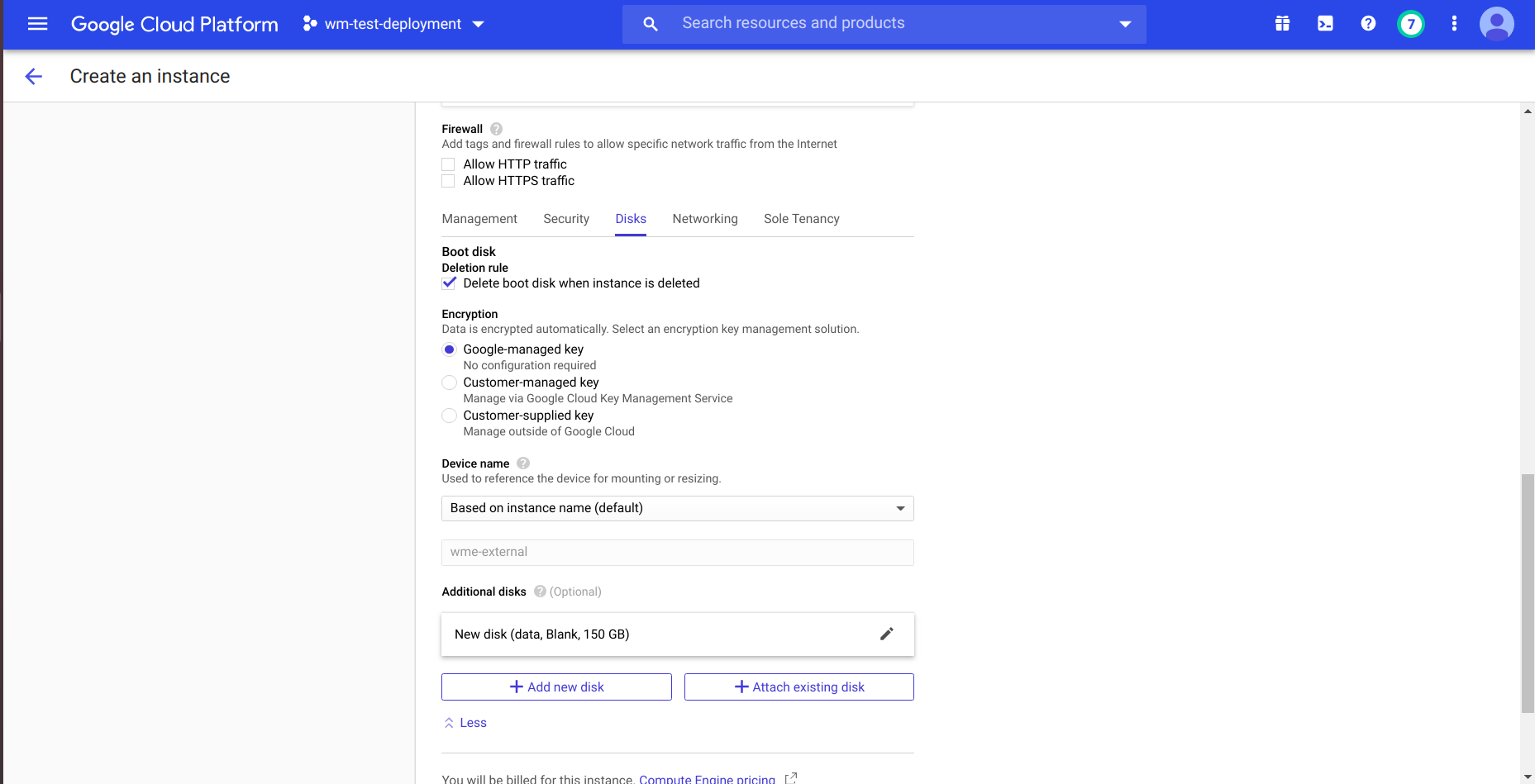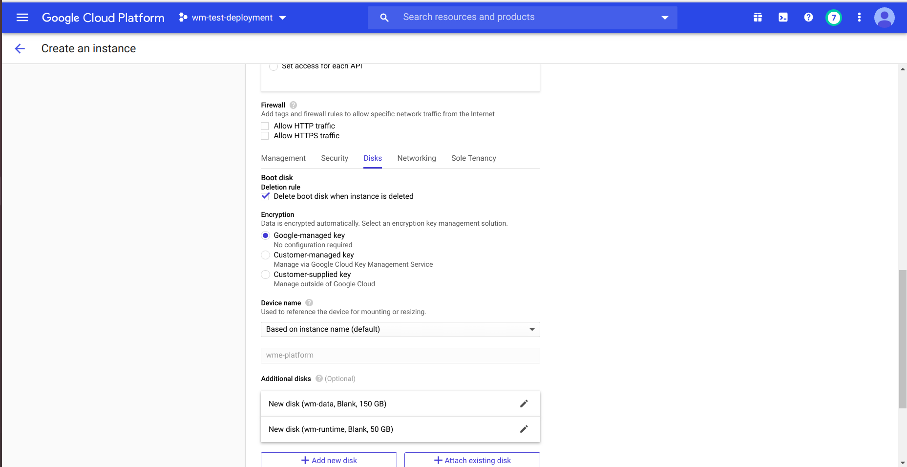• At disk section create disks for wm-data and wm-runtime with 150 and 50 GiB.