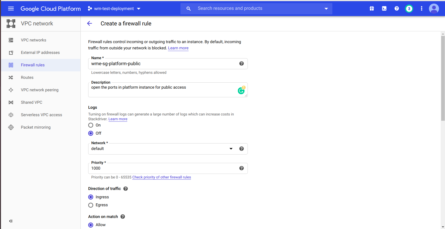• At network section provide respected network tags of your firewall if you using source and target tags at firewall rules and create Instance.