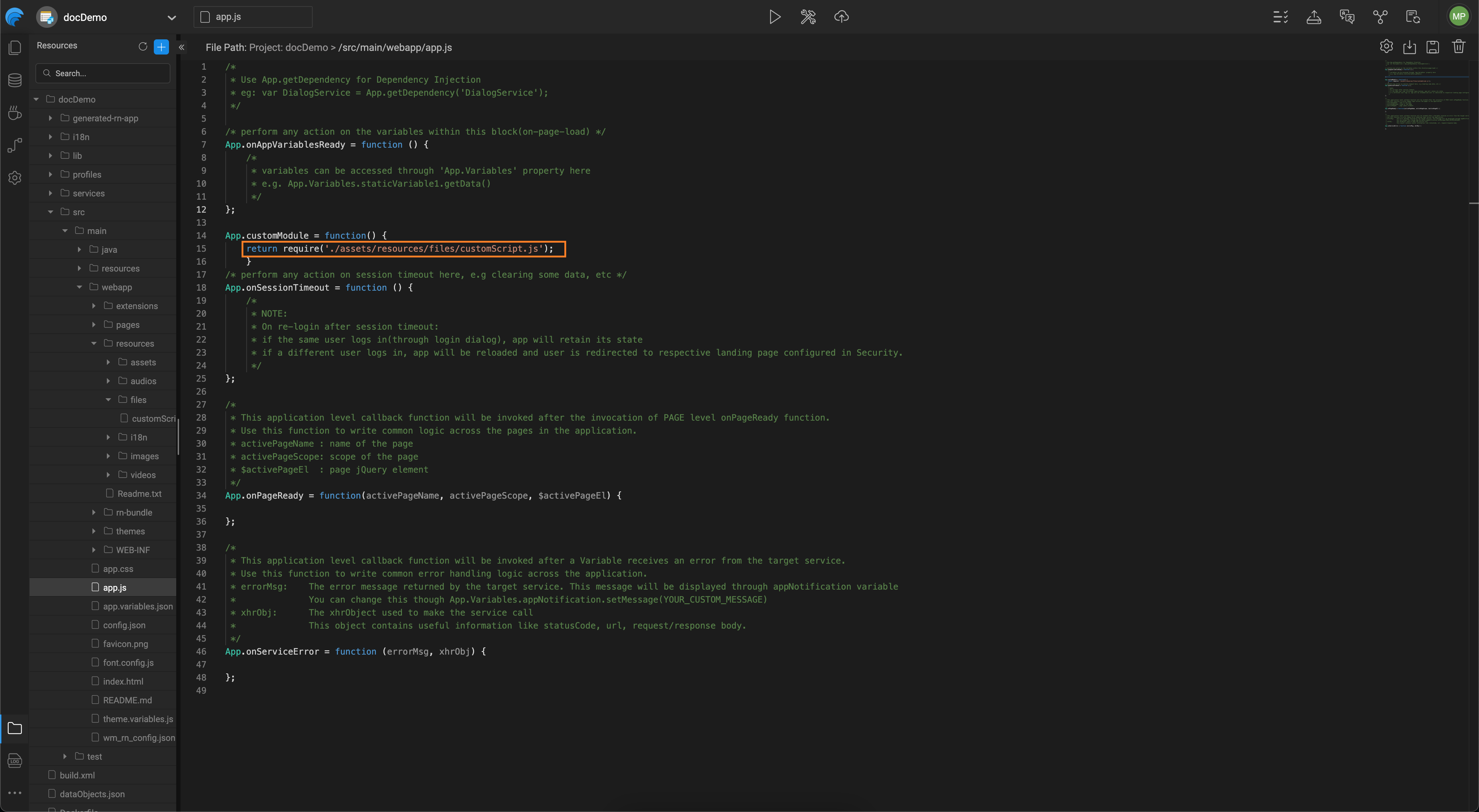 Two files, customScript.web.js for web and customScript.native.js for React Native, are uploaded to the application's resources folder. To use custom JS files in any application, import them using the following code in the app.js file.