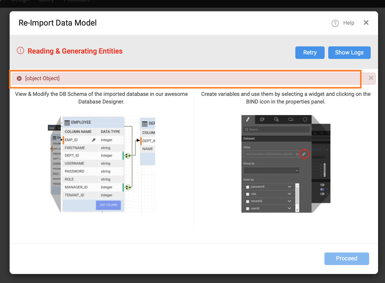 An issue was observed and fixed during the reimporting of the database, where users saw the error message [object Object] instead of the actual error that had occurred.